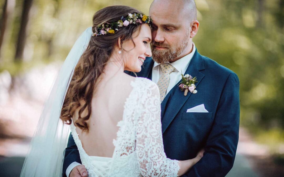 Portræt af brudepar omgivet af smuk jysk natur i en vinmark i Sydjylland